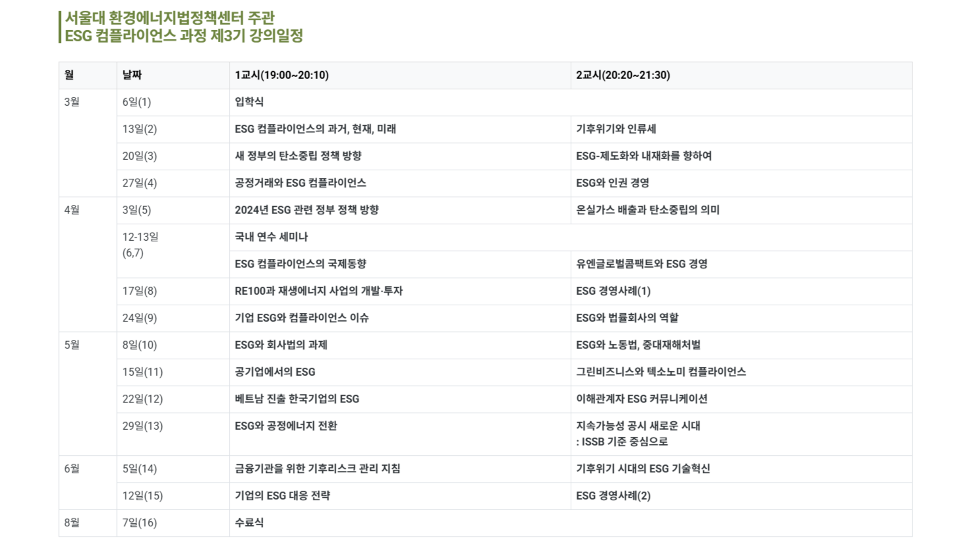 서울대 법학전문대학원 ESG 컴플라이언스 과정은 행정부 고위 공무원, 기업체 임직원, 판사, 검사, 변호사, 회계사 등 각 전문분야 전문가 40명을 선발해 운영되는 국내 최고 수준의 전문 교육 프로그램이다. 조홍섭 환경·에너지법정책센터장, 최봉경 한국법학교수회 회장, 홍진영 서울법대 교수를 비롯한 25명의 교수진이 '유엔글로벌콤팩트', 'ISSB(국제지속가능성기준위원회) 공시 기준', '기후리스크 관리' 등 ESG 관련 최신 국제 동향과 법률, 정책, 실무를 아우르는 깊이 있는 교육을 제공했다.