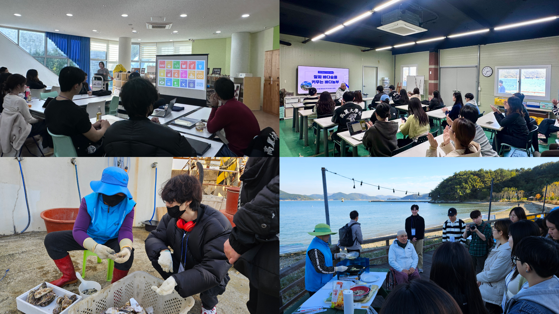 현장 실습은 해양생태 이해부터 시민과학 데이터 수집·활용까지 전 과정을 경험하는 데 초점을 두었다. 첫째날에는 통영RCE에서 포괄적인 ESG 교육이 진행되어, 환경·사회·지배구조 전반의 개념과 기업·정책의 역할을 살펴보았다. 강의 말미에는 이번 시민과학 실습이 ESG 관점의 데이터 활용과 어떻게 이어질 수 있는지 연결해 설명했다. 이어서 통영 지역의 잘피 군락과 해양보호구역 지정의 의미를 설명하며 해양생태계 보전의 중요성을 이해하는 시간이 이어졌다. 강의 후에는 통영의 대표적인 해양 자원인 굴을 직접 손질하고 시식하는 활동도 진행되어, 지역 해양생태와 생활문화가 어떻게 연결되어 있는지 체감하는 경험을 했다.