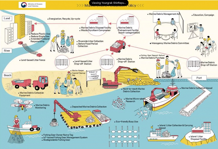▲ 대한민국의 해양쓰레기 관리 정책 모식도(해양수산부 신영락 발표자료에서 화면 갈무리)