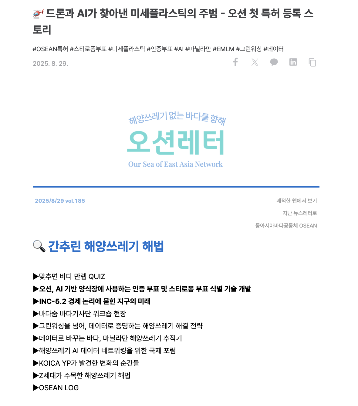 오션레터 185호⎜🚁 드론과 AI가 찾아낸 미세플라스틱의 주범 - 오션 첫 특허 등록 스토리