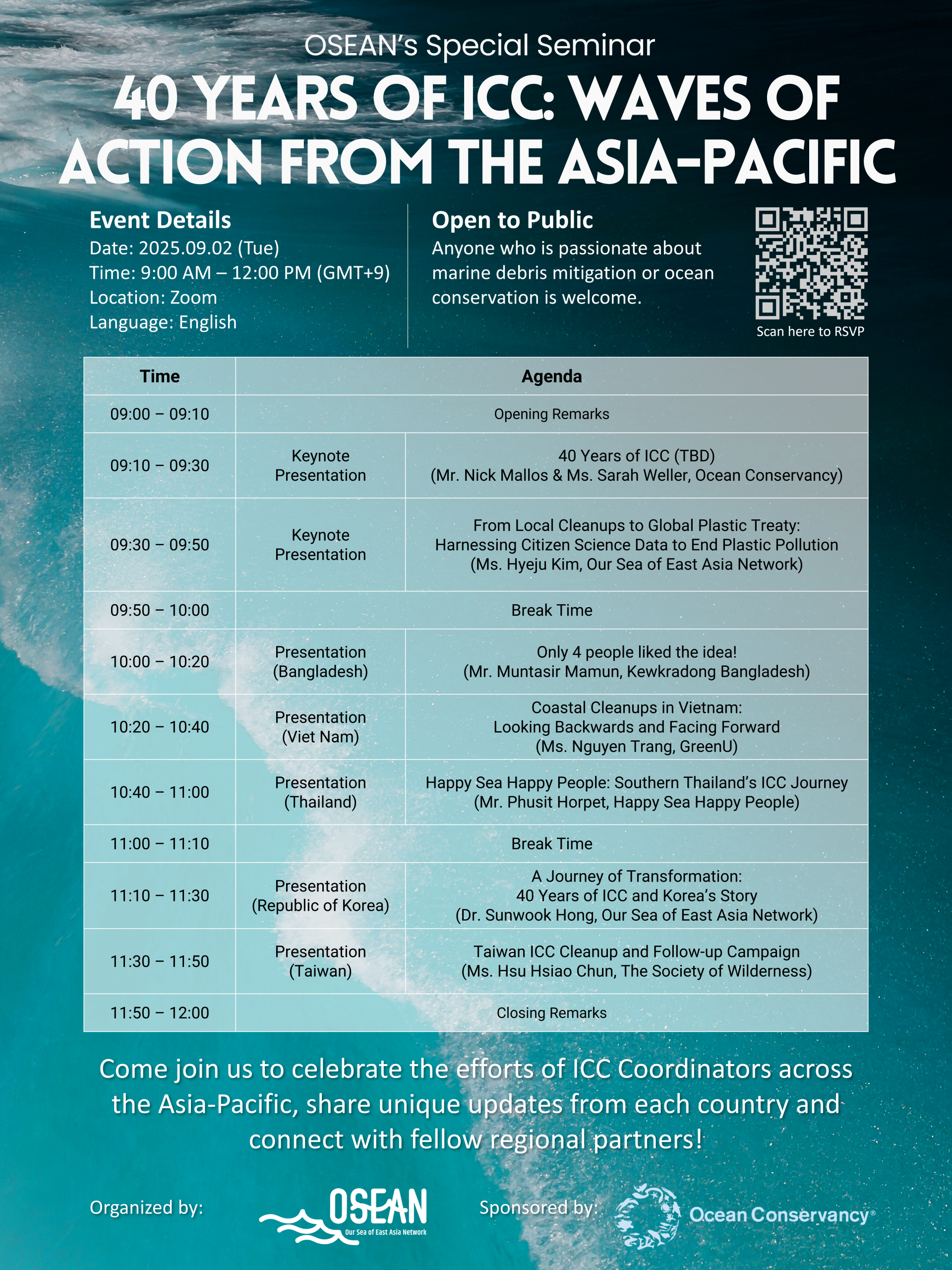 동아시아바다공동체 오션(OSEAN)은 Ocean Conservancy와 함께 국제 연안정화(ICC) 40주년 기념 아시아-태평양 특별 세미나에 초대합니다. “ICC 40주년: 아시아-태평양의 물결(Waves of Action from the Asia-Pacific)”이라는 주제로 열리는 이번 세미나는 아시아-태평양 지역의 ICC 활동가, NGO, 청년단체 등 다양한 이해관계자가 한자리에 모여 지난 성과를 돌아보고, 경험을 나누며, 해양쓰레기 문제 해결의 미래를 함께 모색하는 뜻깊은 자리입니다. 여러분의 많은 관심과 참여 부탁드립니다.