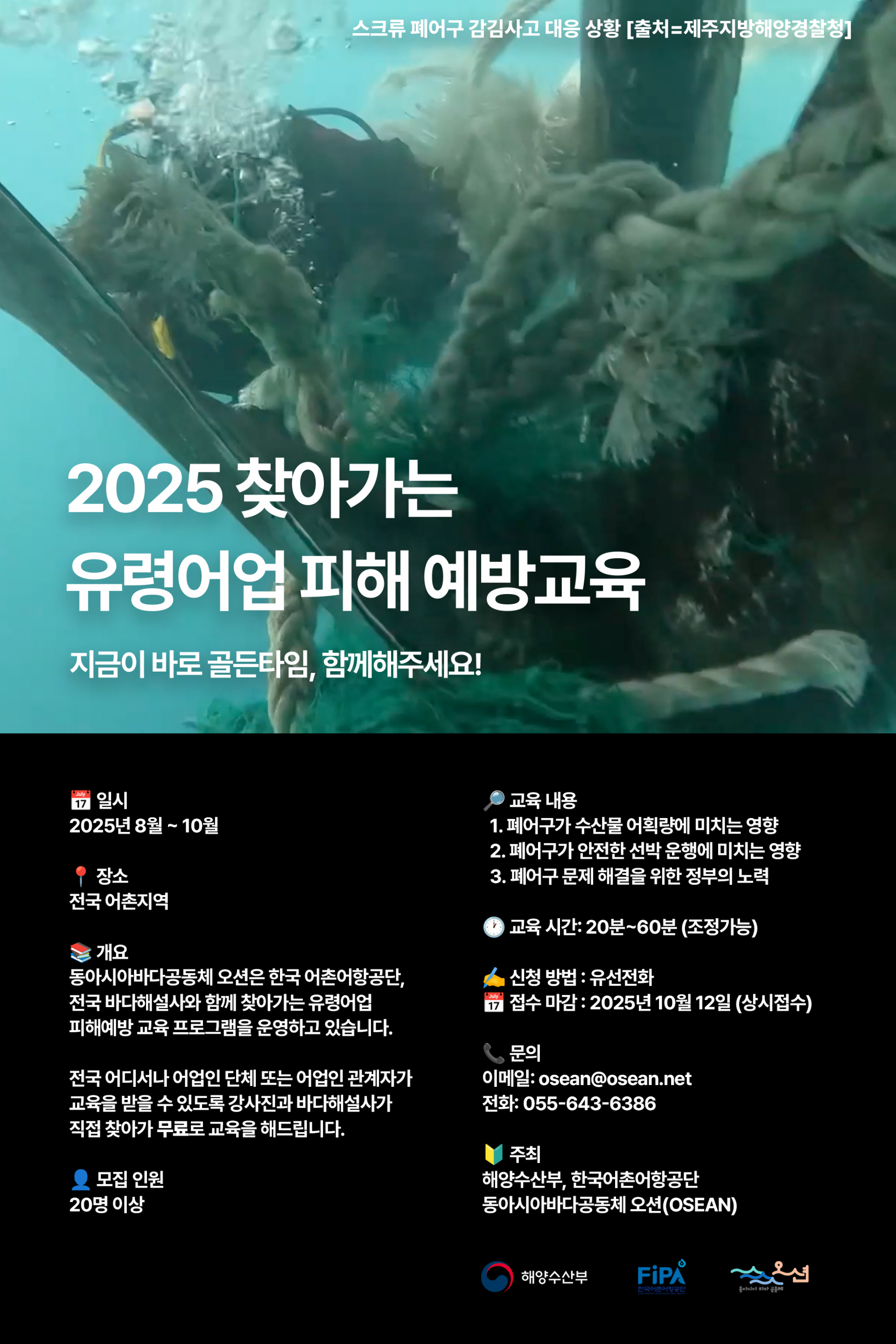 '찾아가는 유령어업 피해 예방 교육 프로그램'을 신청해 주세요!동아시아바다공동체 오션에서 2025년 8월부터 10월까지 '찾아가는 유령어업 예방 교육 프로그램'을 진행하고 있습니다.