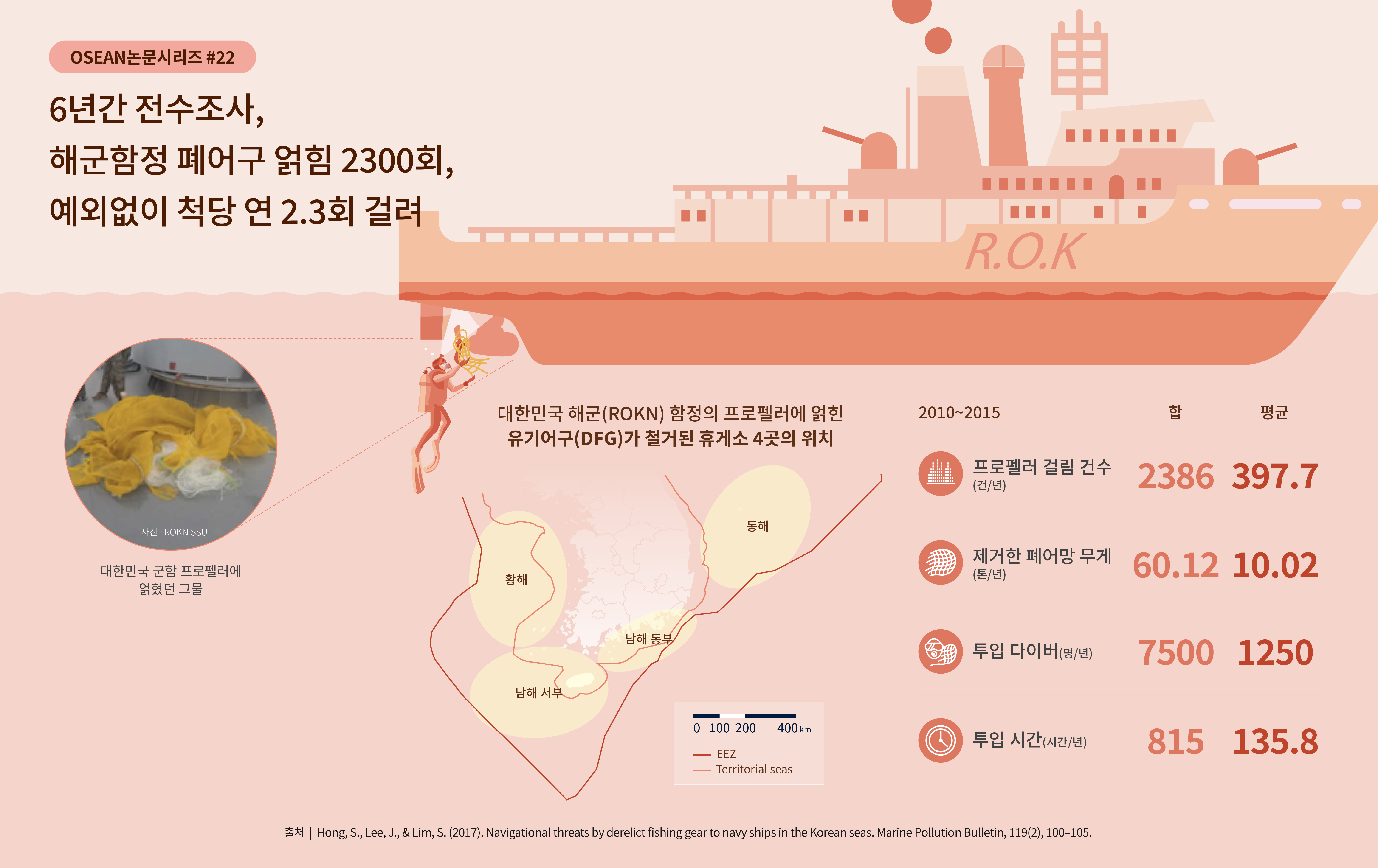 This study assessed the impact of derelict fishing gear (DFG) on navigation. The Republic of Korea's navy (ROKN) recorded every case of approximately 170 naval ships associated with propeller entanglement by DFG from January 2010 to December 2015. The frequency of cases was 2.3 per ship and 397.7 (± 37.5) per year. The amount of DFG disentangled was 0.025 tons per ship and 10.0 (± 1.7) tons per year. The frequency temporally decreased whereas the amount increased over these six years. To disentangle propellers, 3.1 divers were needed on average per case. Propeller entanglement occurred in all local seas and some of these areas showed increases over time. Our study highlights that the impact of DFG on navigational threats has been persistent and ubiquitous and can potentially be reduced by preventing DFG in fishing areas, with a focus on improved management by fishermen and government and with more efficient retrieval of DFG.