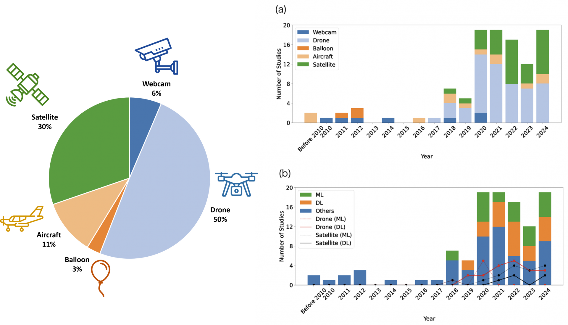 [사진1] (Left) 분석된 109편의 연구에 기반한 원격탐사 플랫폼의 분포; (Right) 2010년 이전부터 2024년까지 발표된 연구를 기반으로 한 플라스틱 쓰레기 탐지를 위한 원격탐사 플랫폼 및 영상 분석 기법의 시계열; (a) 관측 플랫폼(웹캠, 드론, 풍선, 항공기, 위성)별 연도별 논문 수; (b) 영상 분석 기법의 연도별 변화 추이로, 머신러닝(ML), 딥러닝(DL), 규칙 기반 또는 수동 방식(Others)으로 구분함