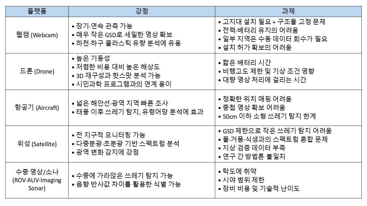 (사)오션 제564회 세미나에서 앨리시아 연구원이 2024년까지 발표된 연구를 기반으로, 원격탐사(Remote Sensing)와 AI 기반 영상분석(Image Analysis)이 해양 대형 플라스틱(macro-plastic) 탐지에 어떻게 활용되고 있는지에 대한 최신 리뷰 논문을 소개했다. 이번 논문은 해안 및 하천 등 다양한 관측 플랫폼을 비교·분석하며, 기술의 흐름과 앞으로의 방향성을 짚어본 종합 리뷰 논문이다.